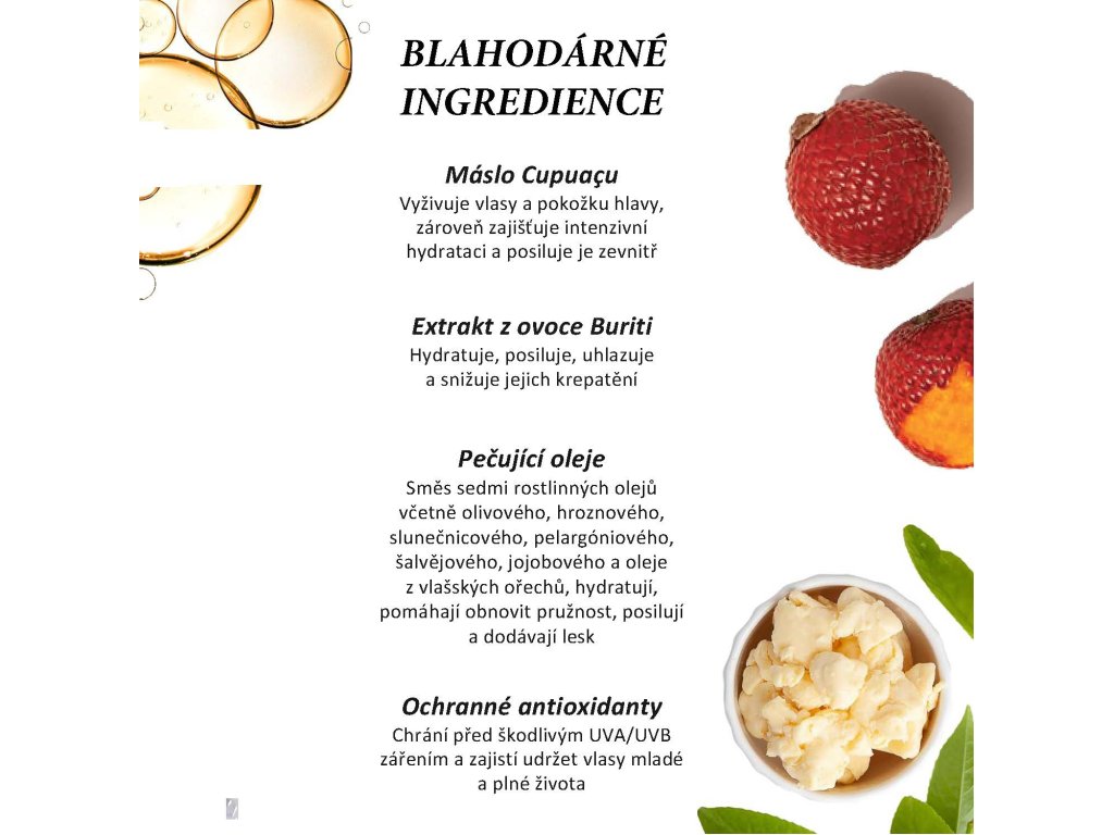MÁSLO CUPUAÇU vyživuje vlasy i pokožku hlavy, zároveň zajišťuje hydrataci a vlasy posiluje. PEČUJÍCÍ OLEJE směs sedmi botanických olejů: olivový, hroznový, slunečnicový, pelargóniový, šalvějový, jojobový a ořechový hydratují, pomáhají obnovovat elasticitu, posilují a dodávají lesk. OCHRANNÉ ANTIOXIDANTY chrání před škodlivým UVA/UVB zářením, pomáhají udržovat perfektní vzhled vlasů, které jsou mladé a plné života.