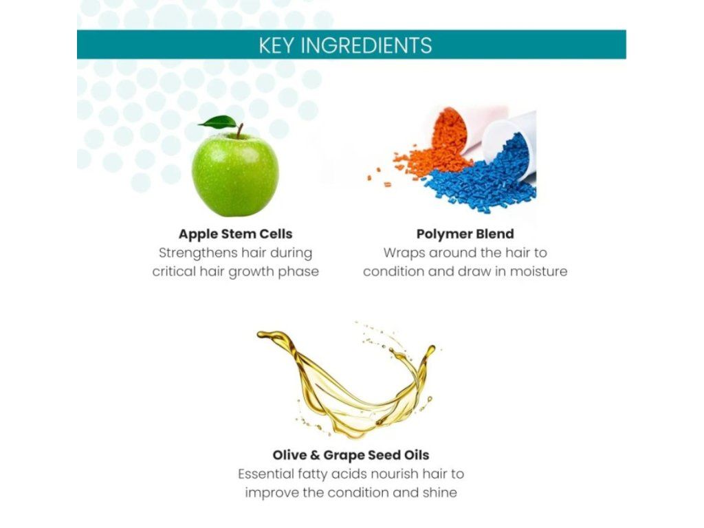 Kmenové buňky z jablka Uttwiler Spätlauber podporují vitalitu a sílu vlasů. Olivový a hroznový olej vlasy vyživují a dodávají jim lesk. Polyquaternium pomáhá vytvořit plnější efekt a lepší hydrataci. Směs rostlinných antioxidantů chrání vlasy i barvu před UV zářením a stárnutím.